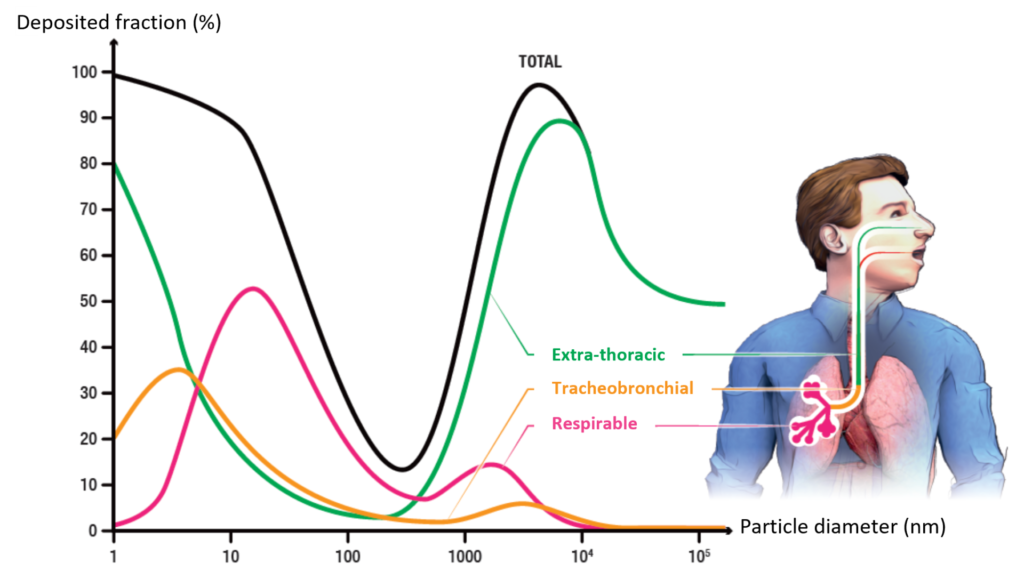 Deposition of particles along the respiratory tree is guided by their size. Particles between 10 nm and 100 nm are mainly distributed in the alveolar region.